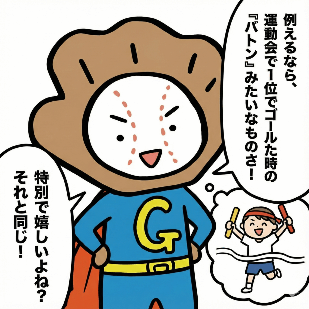 例えるなら、運動会で1位になってゴールした時に持っていたバトン、みたいな感じかな。そのバトンは、1位になった証として、きっと特別な宝物になるよね?ウイニングボールも、それと同じくらい、いや、それ以上に価値のある「勝利の証」であり、「宝物」なんだ!