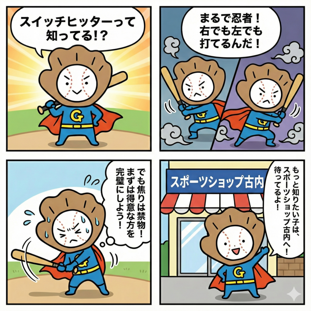 スイッチヒッターは、右バッターと左バッター、両方の武器を持ってるってこと!ものすごい努力と練習が必要だけど、それだけ野球の面白さが倍増する、夢のあるプレースタイルなんだ!みんなもいつか挑戦してみたくなるかな!?